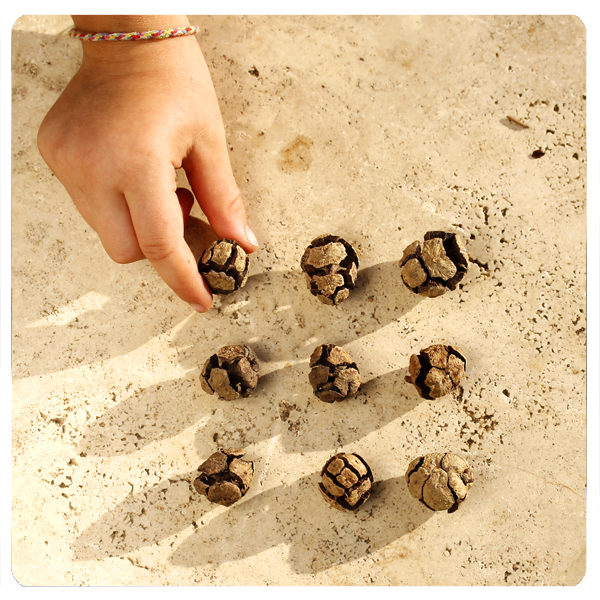 אפשר לשחק את זה עם כל חפץ, רצוי עגול – ספלולים, איצטרובלים (כמו בתמונה למטה) מטבעות ועוד.